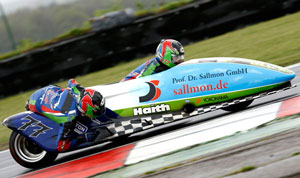 Speaking afterwards, a pleased Tim said: "It's been a tough weekend with three hard, competitive races so I'm delighted to come away with a bigger lead in the title race. Ben's outfit was quicker than mine along the long straights and he stole a march on me in the first two races but I felt stronger all weekend around the corners so dug that little bit deeper for the final race to stay with him all the way through the race. I'd been going up the inside on a number of laps and he obviously had this covered on the final lap but it was my intention to catch him by surprise and go round the outside instead which worked perfectly. The backmarker compromised things a little and there was a bit of a coming together between all three outfits but I didn't think I'd done anything wrong so I was pleased when the officials ruled it a fair move and was delighted to end the weekend on a high. We've still got a bit of work to do on the bike but we're feeling strong so we can go to Germany in a confident frame of mind."