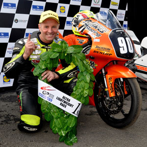 It was the 50th time Ian has graced the podium at Dundrod and the victory took his Ulster Grand Prix race win tally to 18, whilst he has tasted success on the world famous circuit on no less than 21 occasions, placing him second only to Joey Dunlop in both the respective all-time lists, an honour that is likely to stand for many years to come. Ian's first outing of the day was in the first Supersport race on the W.A. Corless/Jackson Racing 600 and it was soon obvious to the many spectators around the circuit that he was clearly in the mood on his final appearance around the 7.4 mile fast flowing circuit as, from 14th on the fourth row of the grid, he swept past the Joey Dunlop Grandstand at the end of the opening lap in 4th place right behind the leading trio of Guy Martin, Bruce Anstey and Michael Dunlop and just ahead of Lee Johnston with a further gap back to sixth place man William Dunlop. With the fastest lap of the race so far at 3:44.263, Ian had closed right up on Dunlop and had opened a gap to Johnston as the leaders headed on to their third lap of six. Dunlop responded with a lap of 3:42.795 but Ian was very much still on his case with Johnston some 3 seconds back in fifth. Dunlop was a retirement on the fourth lap as Lougher now moved up to third but on the fifth lap Johnston was back in the hunt for a rostrum place as he closed to just over two seconds and on the final lap Ian was forced wide at Tornagrough as Johnston went through to take third with Lougher just over a second back in fourth and in turn over a second clear of fifth place man William Dunlop. Next, it was straight on to the ILR Kawasaki Ninja ZX-10R for the Superstock race. With no practice taking place during the week, the race organisers decided to run a short practice session at the start of the day and Ian finished this session second quickest, although he did line up on the second row of the grid for the six lap race. The early morning rain had given way to drier conditions and a clear dry line was appearing round the track. There was drama on the start line as Lee Johnston and Rob Barber collided, with both riders fortunate to escape unharmed. It was Gary Johnson who led at the end of the opening lap by just 0.2s from Michael Dunlop with Bruce Anstey in third two seconds back closely followed by Ian and Dean Harrison. The front two were rapidly pulling away though and by the end of lap two, their gap over Lougher, who was now in third, was 5.6s. Ian in turn was in the midst of a 3 rider dice with Anstey and Harrison with just 0.6s covering the trio. By now the course was almost dry for the entire lap, just a few damp patches under the trees remaining, and Dunlop fought his way to the front on lap three with a 128mph+ lap. The battle was raging for third though with Lougher and Harrison in particular exchanging places, at the end of the second lap it was Lougher, a lap later it was Harrison with Kiwi Anstey right in the mix. Just like last year's race, Ian was riding brilliantly on the Kawasaki but on the fifth lap his challenge for a rostrum place was effectively ended with he just went wide at the hairpin and in the end he settled for a fifth place finish. The next race, the Ultra-Lightweight, was expected to witness a battle between Ian, on the Matt Jackson Racing 125 and Christian Elkin on a Moto 3 bike, and this indeed proved to be the case. The red flags soon came out due to an incident involving Peter McKillop who crashed out on the exit of Tornagrough, thankfully without injury. On the re-start, held over 3 laps, it was Ian who grabbed the lead and at the end of the opening lap he led Elkin by one second with these two already well clear. As the duo headed on to the last lap, it was still Ian by the smallest of margins and, in a frantic last lap which saw the lead exchange hands on three occasions, it was the experience of Lougher that came through as he led on the all-important run through the Flowbog and Quarries section to the finish line. With the crowd at the grandstand eagerly waiting, and the commentator's voice now in overdrive, it was Lougher who appeared first in the distance and despite a big effort from Elkin, Ian wasn't going to be denied and he held on by just 0.339s to score one of the most popular wins of the day. Prevented from taking part in the next Superbike race, the second Supersport race saw Ian come from 14th on the grid to 8th at the end of the opening lap and sandwiched between Dean Harrison and Dan Cooper. As Harrison moved clear on the next lap, a thrilling three-way battle was now taking place for seventh between Cooper, Lougher and Ivan Lintin. The battle raged for the remainder of the race with Lintin taking seventh, Ian eighth and Cooper in ninth, with the duo having rapidly closed in on sixth place man Cameron Donald. It proved to be the last race finish for Ian round Dundrod as in the following Superbike race, the last on the programme, he retired on the opening lap. So as the dust settles on another Ulster Grand Prix, four top ten finishes including a race win has been a fitting end to Ian Lougher's Dundrod adventure. Ian Lougher: ''I just missed out on a rostrum in the opening 600 race, and on the 125 Christian Elkin and I passed each other a few times on the last lap. He actually put his front wheel to my knee and I thought, 'you can't pass there'. It was nice to have a 125 win to finish my UGP career. Big thanks go to everyone who has supported me through the years, all my sponsors and the fans.'' Back Dunlop devastates opposition in Motorsport Merchandise F1 race